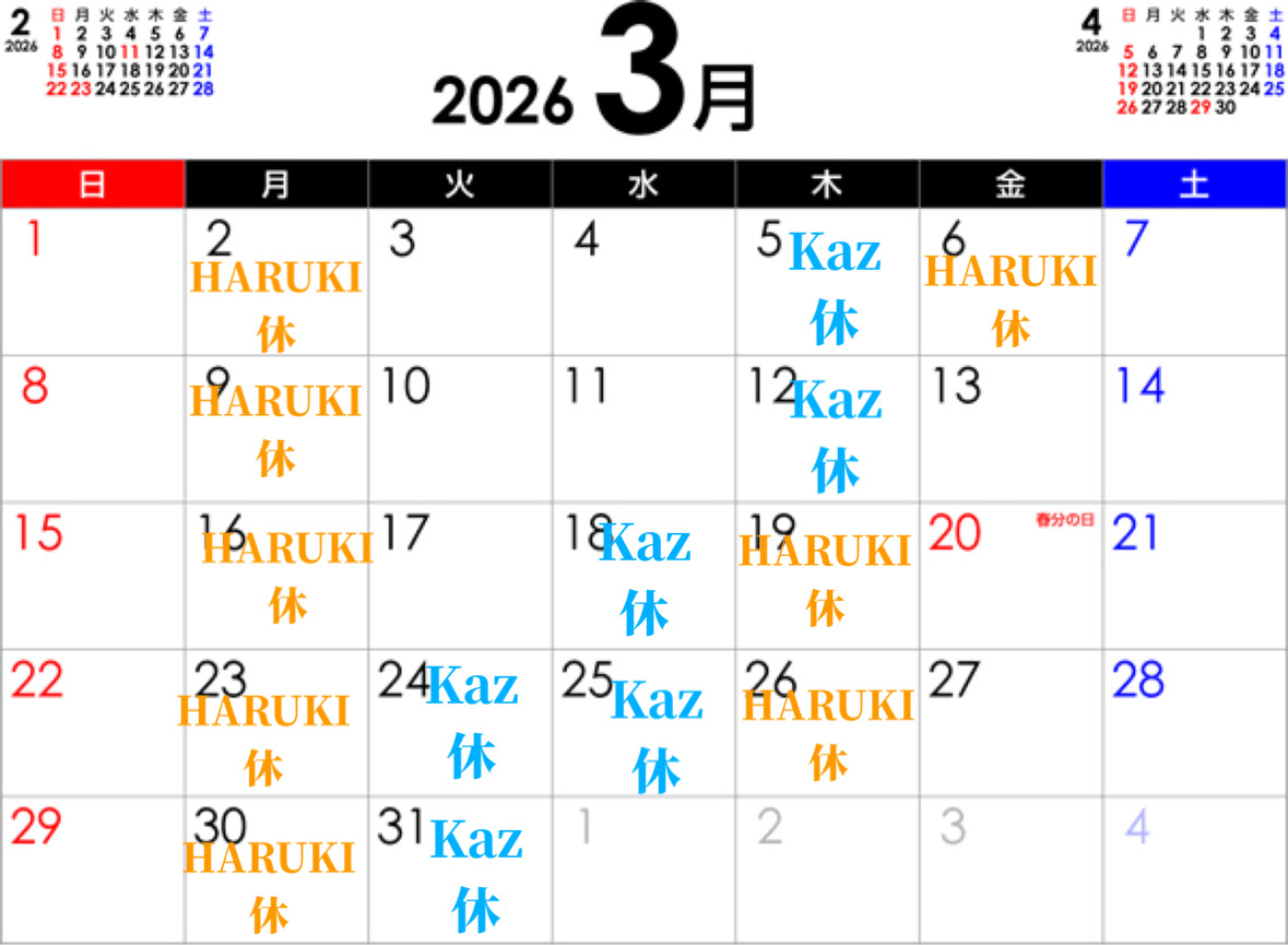 Barber’z UNITEです! 2026年03月のスタッフごとの休業日をお知らせいたします!